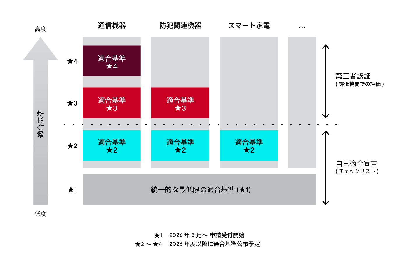 詳細は、IPAのWEBサイト「セキュリティ要件適合評価及びラベリング制度(JC-STAR)」をご参照ください。